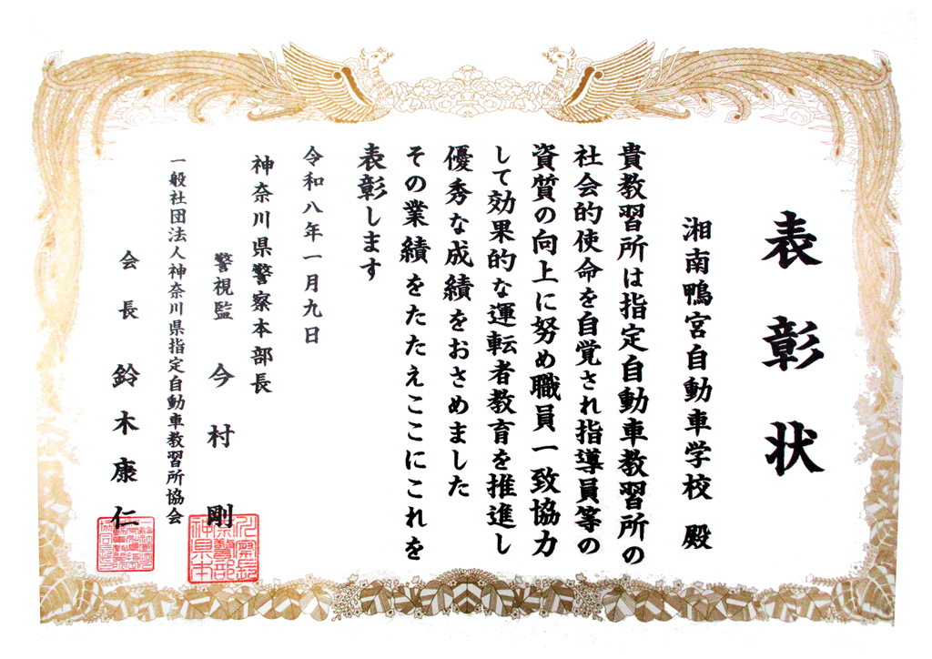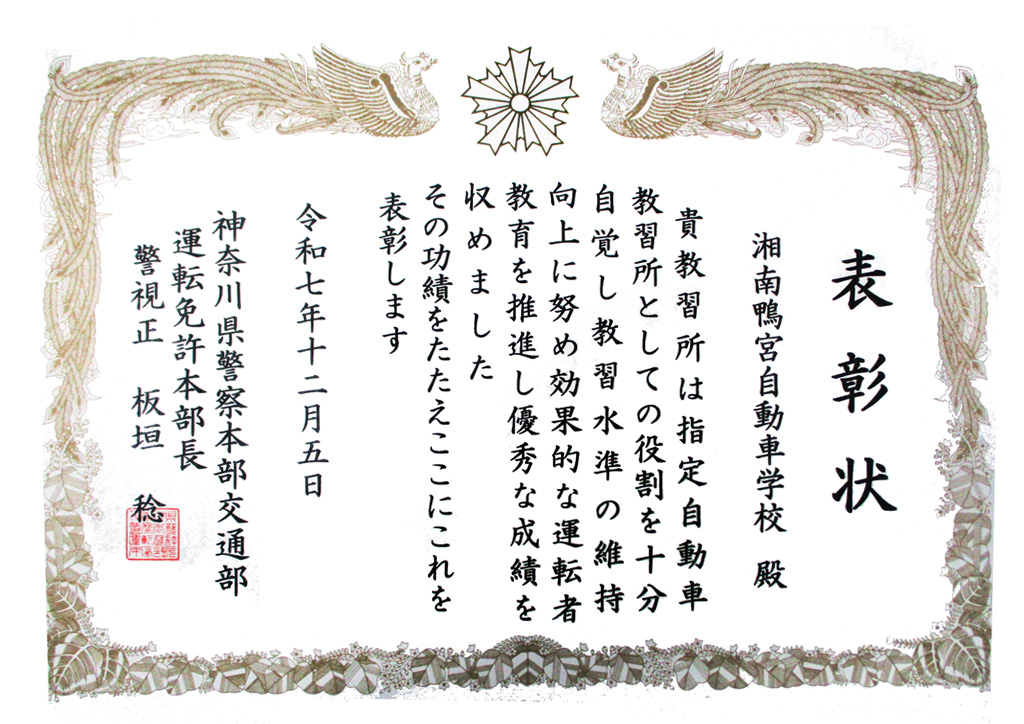 この「神奈川県警察本部長表彰」は、県下でもごく限られた教習所および交通安全功労者のみを対象とした表彰であり、例年数校程度にのみ授与されるものです。